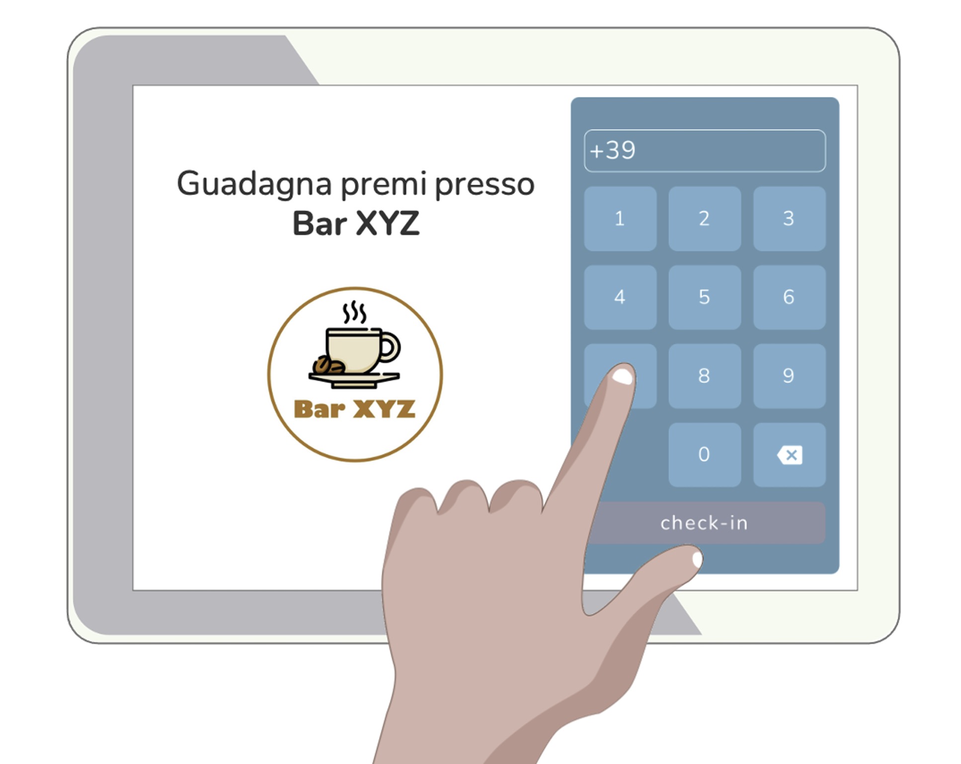 - Il cliente vede in cassa il tablet esposto con il logo del negozio/ristorante e una tastiera su cui, se desidera, può fare check-in digitando il proprio numero di cellulare.