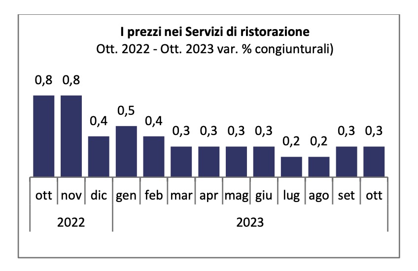 L’inflazione nei servizi di ristorazione scende al 4,7% dal 5,1% di settembre Anche i prezzi della ristorazione commerciale rallentano dal 5,4% al 4,9%. La dinamica dell’inflazione generale registra una importante decelerazione dovuta in gran parte alla variazione tendenziale dei prezzi dei beni energetici, che nell’ ottobre 2022 registrarono forti aumenti dei prezzi.