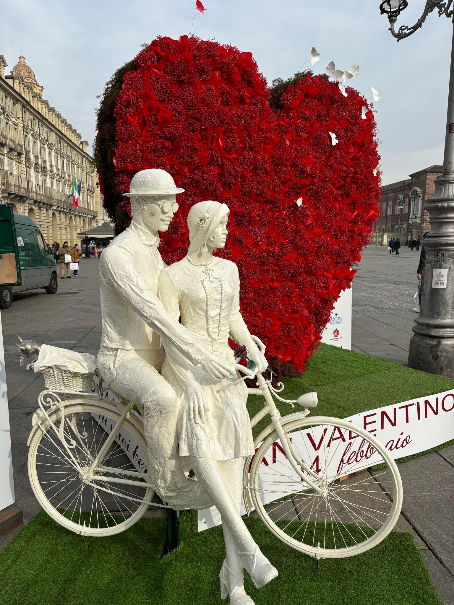 Quest’anno, accanto al cuore, è posizionata anche la scultura di una romantica coppia in bicicletta, realizzata dal giardiniere Rodolfo Marasciuolo, le cui creazioni, fatte con oggetti di recupero come vecchie bici e reti metalliche, abbelliscono già numerose aiuole e giardini pubblici sparsi per la città.