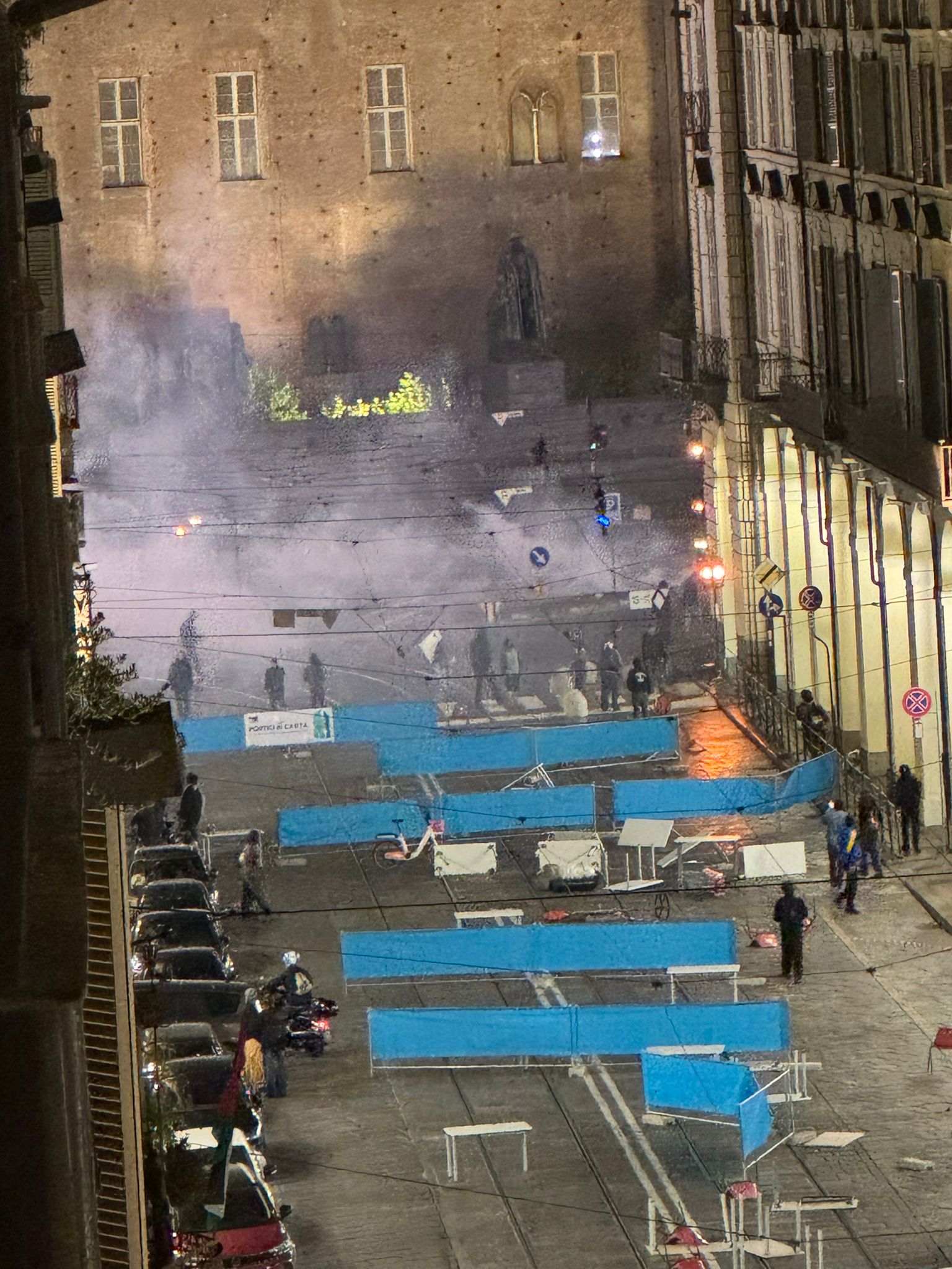 Una notte di tensione e vandalismi ha turbato il cuore della città. Durante le proteste di venerdì sera, alcune frange del corteo hanno danneggiato le strutture già allestite per Portici di Carta in via Po e piazza Castello: transenne divelte, sedie bruciate, tavoli rovesciati e vetrine spaccate. In diversi casi, i baristi sono stati costretti a chiudersi all’interno dei locali per paura di ulteriori atti di violenza.