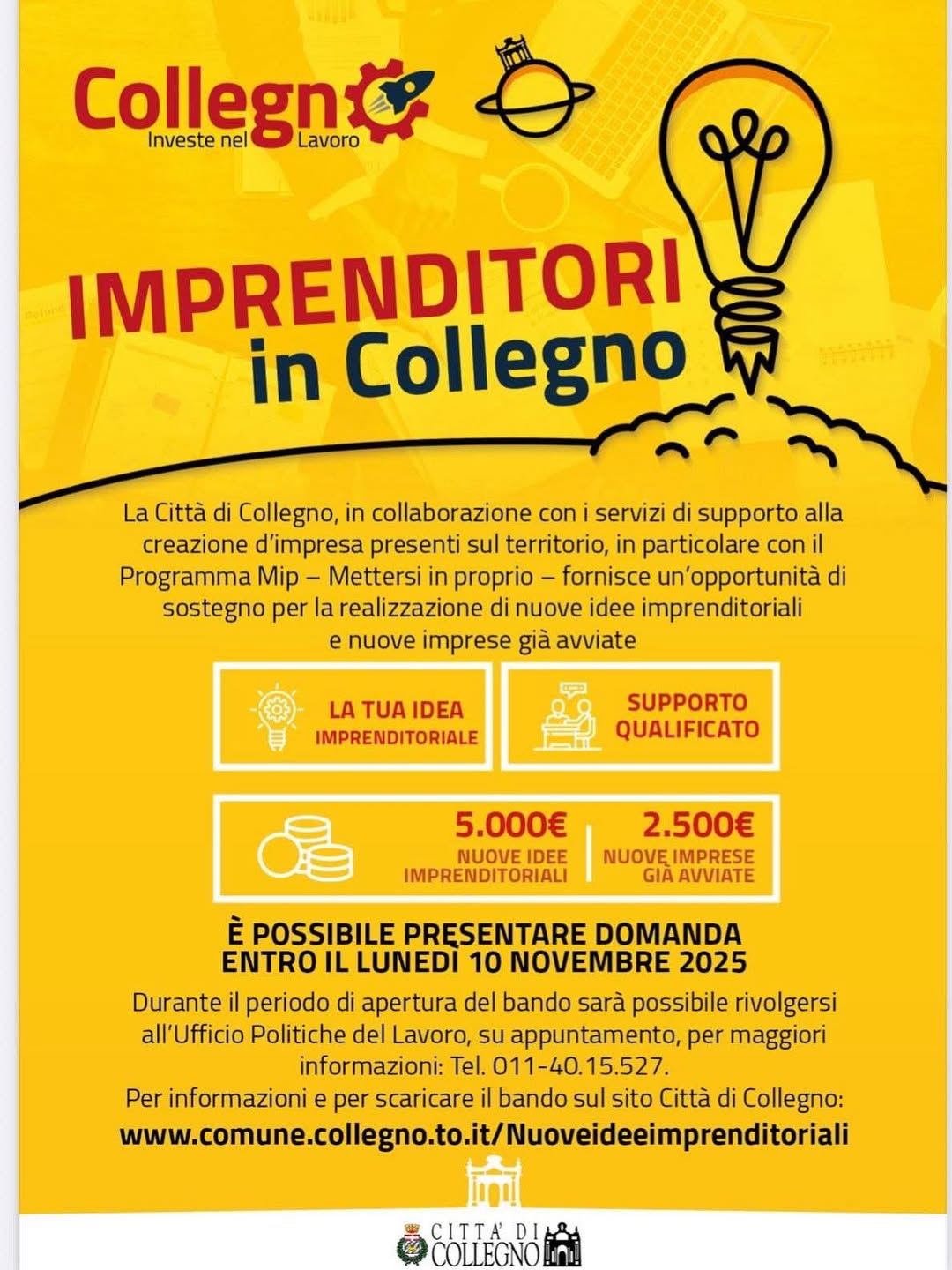 Riparte con alcune novità la nuova edizione del bando “Imprenditori in Collegno 2025”, l’iniziativa promossa dal Comune di Collegno per accompagnare e sostenere chi desidera trasformare un’idea in impresa.