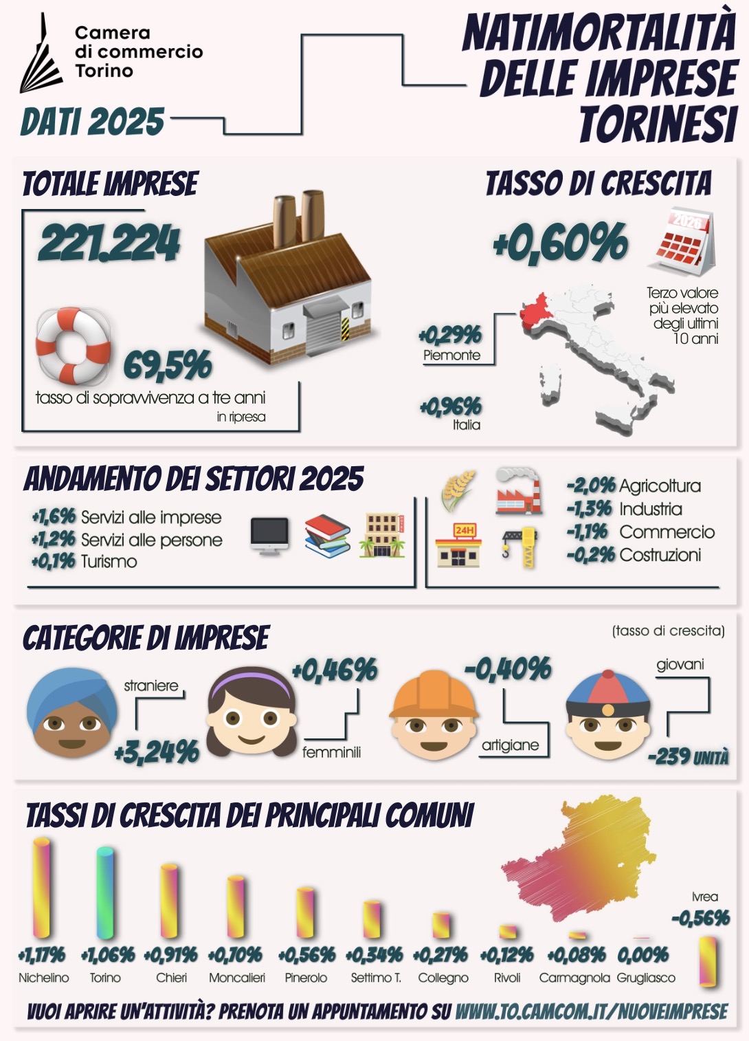 Il quadro che emerge dai dati conferma dunque una fase di moderata ripresa del sistema imprenditoriale torinese, trainata in particolare dal settore dei servizi, mentre restano sotto pressione comparti tradizionali come commercio e manifattura. In questo contesto, i servizi di accompagnamento e consulenza per chi vuole mettersi in proprio rappresentano uno strumento importante per sostenere la nascita di nuove attività e rafforzare il tessuto economico del territorio.